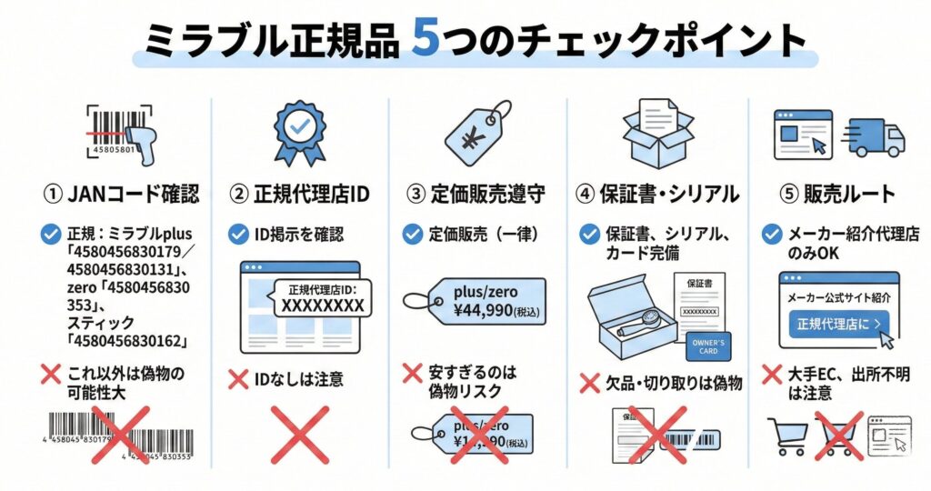 はい。正規品のJANコードはミラブルplus用に「4580456830179」または「4580456830131」、ゼロは「4580456830353」と決まっています。箱や本体底面に記載されているJANが違う場合は偽物の可能性が高いです。