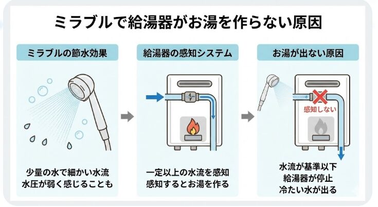 専門知識として、ミラブルのミスト水流はストレート水流に比べて約60%の節水効果があり、その結果、着火に必要な水圧・水量を満たせずに給湯器が停止するリスクが高まると指摘されています。