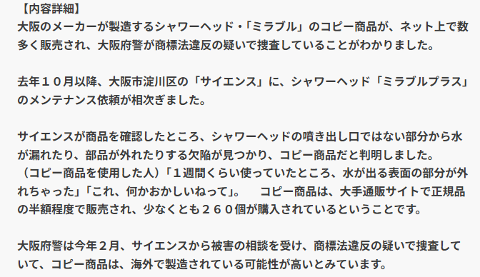 ある購入者が「使い始めてから1週間ほど」で、シャワーヘッドの“吹き出し口ではない部分”――たとえば接続部や本体の継ぎ目あたり――から水漏れが起きたり、部品が外れたりする不具合が発生。調べたところ、その製品は「コピー品(偽物)」と断定されました。 - 「新品・未使用」で購入したのに保証やシリアル番号が不明/保証書なし