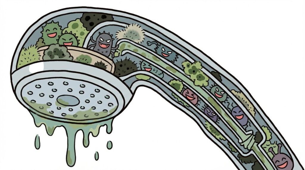 シャワーヘッドの内部には使用後も水が残ります。浴室の湿気と皮脂汚れが加わると、カビや雑菌が一気に繁殖。